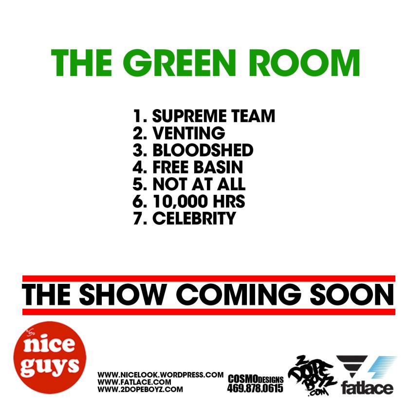 The day has finally arrived!! Today 2Dopeboyz, Fat Lace and The Niceguys are proud to present THE GREEN ROOM EP. With their debut album The Show scheduled to be released in 2010, The Niceguys wanted to present some music to fans and supporters to quiet the stomach rumblings. 7 songs for your listening pleasure. So feel free to listen, post, share, tweet or hate on. Either way, we appreciate it. Happy Holidays.